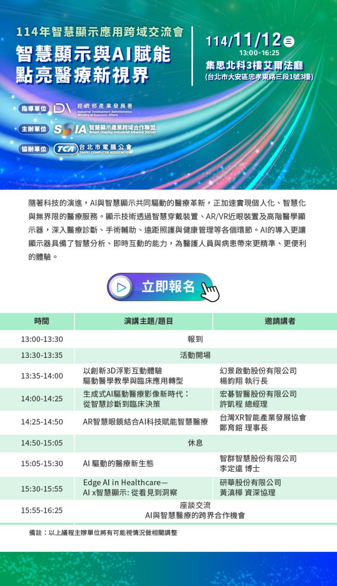AI與智慧顯示正加速推動醫療革新!從AR/VR近眼裝置及手術輔助、智慧穿戴裝置健康監測,到高階醫學顯示器應用,AI讓顯示技術具備即時分析與互動能力,打造更精確、更便利的醫療體驗。本場邀請 幻景啟動、宏碁智醫、台灣XR智能產業發展協會、智群智慧、研華 等五位業界專家,聚焦「顯示 × AI × 醫療」的跨界觀點與實務案例分享,並於座談交流中探索未來產業合作新契機。